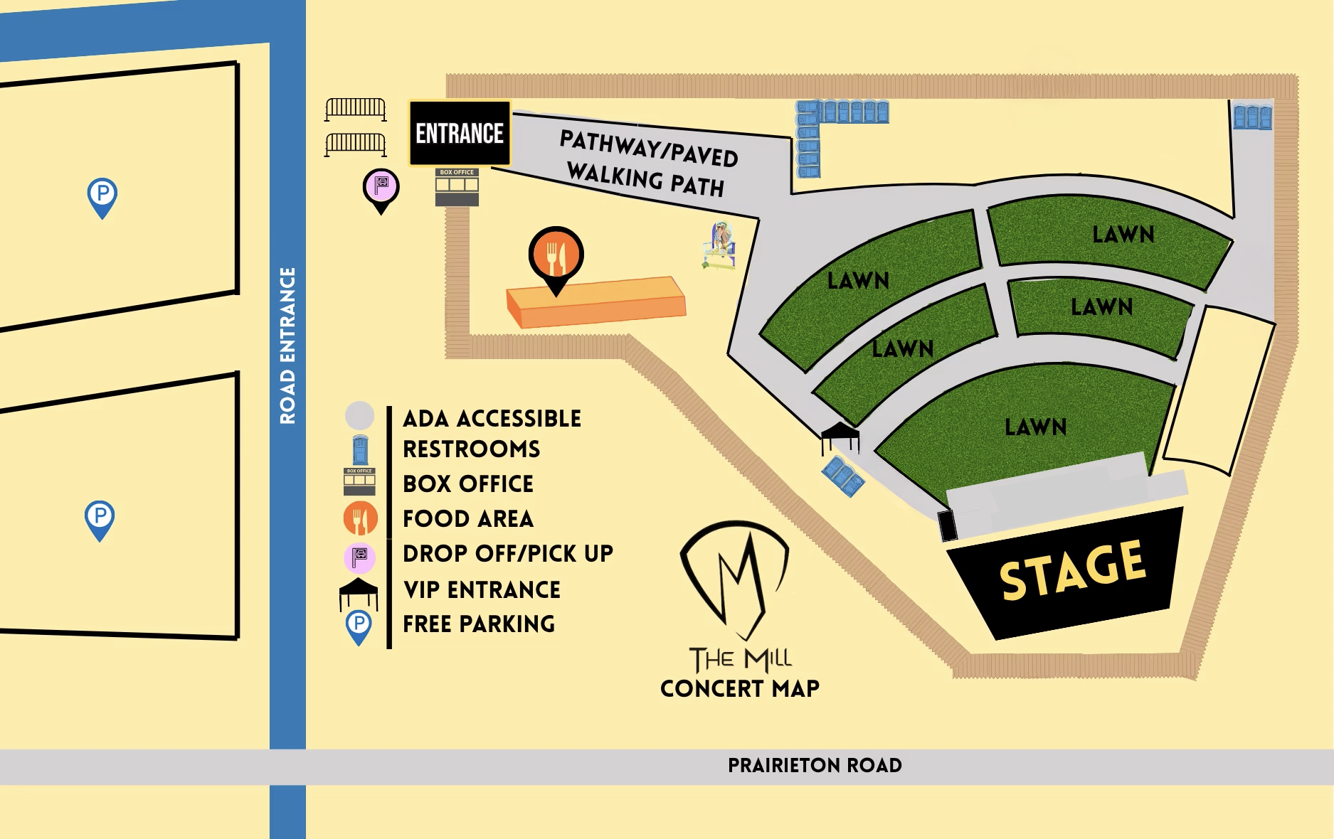 👉All attenders should enter The Mill parking lots by traveling southbound on 1st Street / Prairieton Road and using the main entrance as usual.